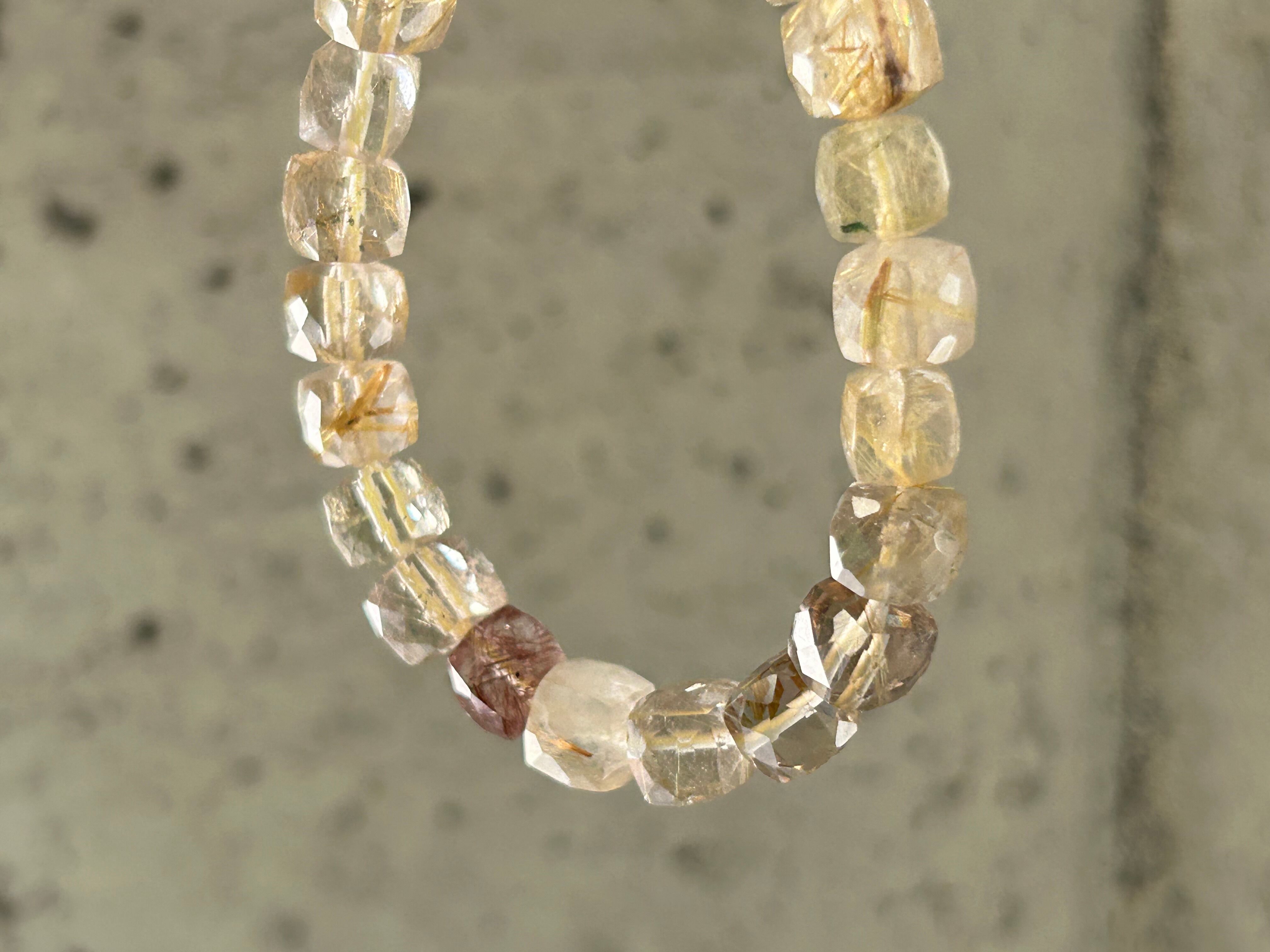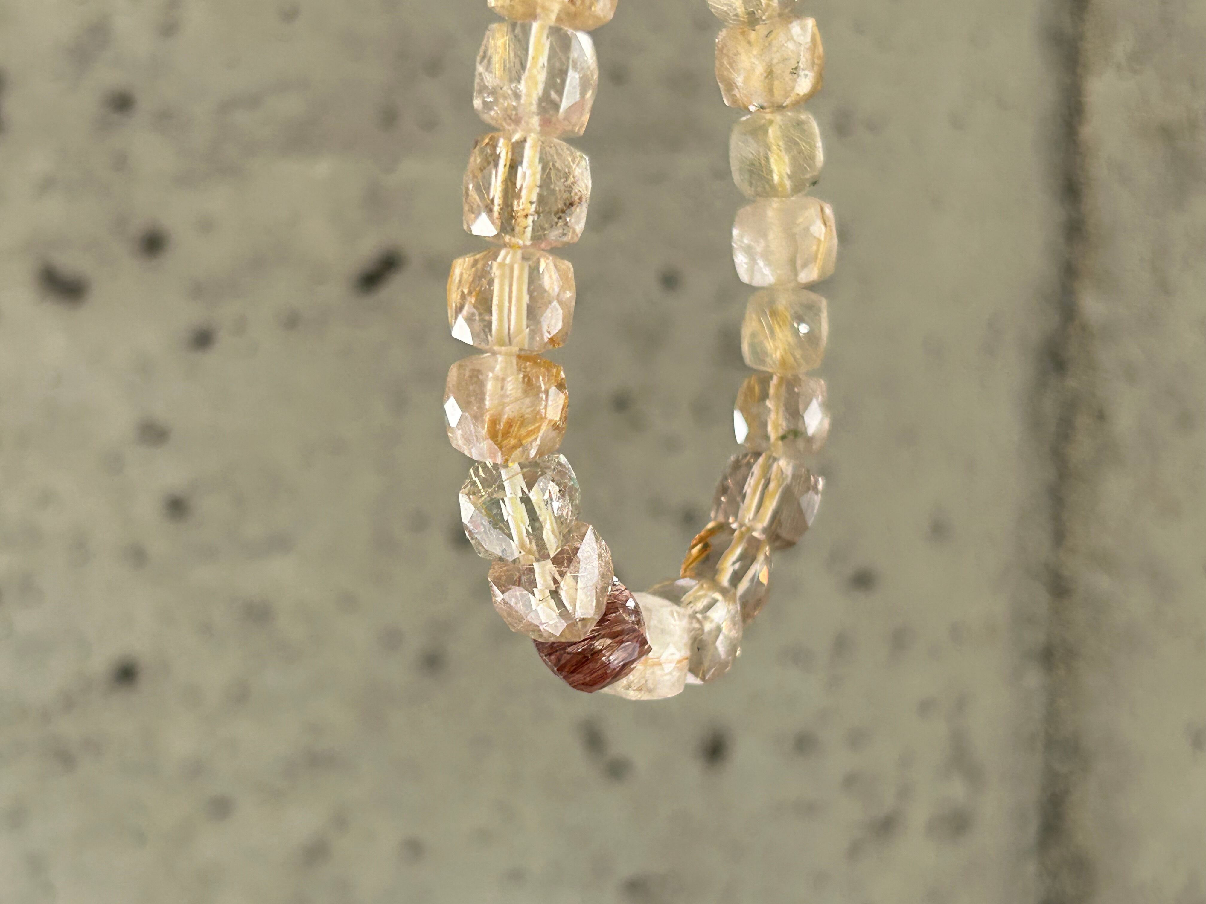 繊細な多面カットが施されたルチルクォーツは、美しいキューブ型でその方向によって異なる光の反射が楽しめます。